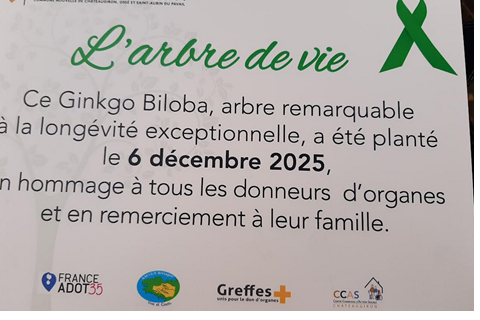 Le 6 décembre 2025, le maire de Chateaugiron, M.Yves Renaud, dans le cadre de l'engagement Ville Ambassadrice de Don d'Organes (convention du 27 juin 2025), en présence des représentants de France ADOT 35, M. Franck Robin, d'Amigo Bretagne, M. Christian Lefort, de Transhépate Bretagne-Ouest et de France Rein, M. Jean-Yves Launay, a planté un Gingo Biloba en hommage à tous les donneurs d’organes.