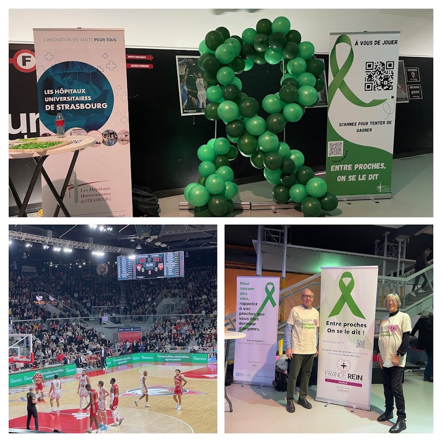 Samedi 30 janvier, F.R. Alsace, représentée par Régine et Jean‑Paul, a participé à une action de sensibilisation au don d’organes lors du match de basket de la SIG au Hall Rhenus de Strasbourg.