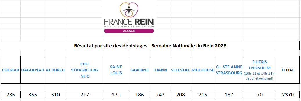 La Semaine du Rein en Alsace constitue un rendez‑vous incontournable, organisé comme chaque année sur cinq jours ouvrés. Pour cette 21ᵉ édition, qui s’est tenue du 9 au 13 mars 2026, pas moins de 50 bénévoles se sont mobilisés dans 10 hôpitaux et un Centre de Santé, permettant de réaliser 2 370 dépistages vs 2025 + 10,6%.