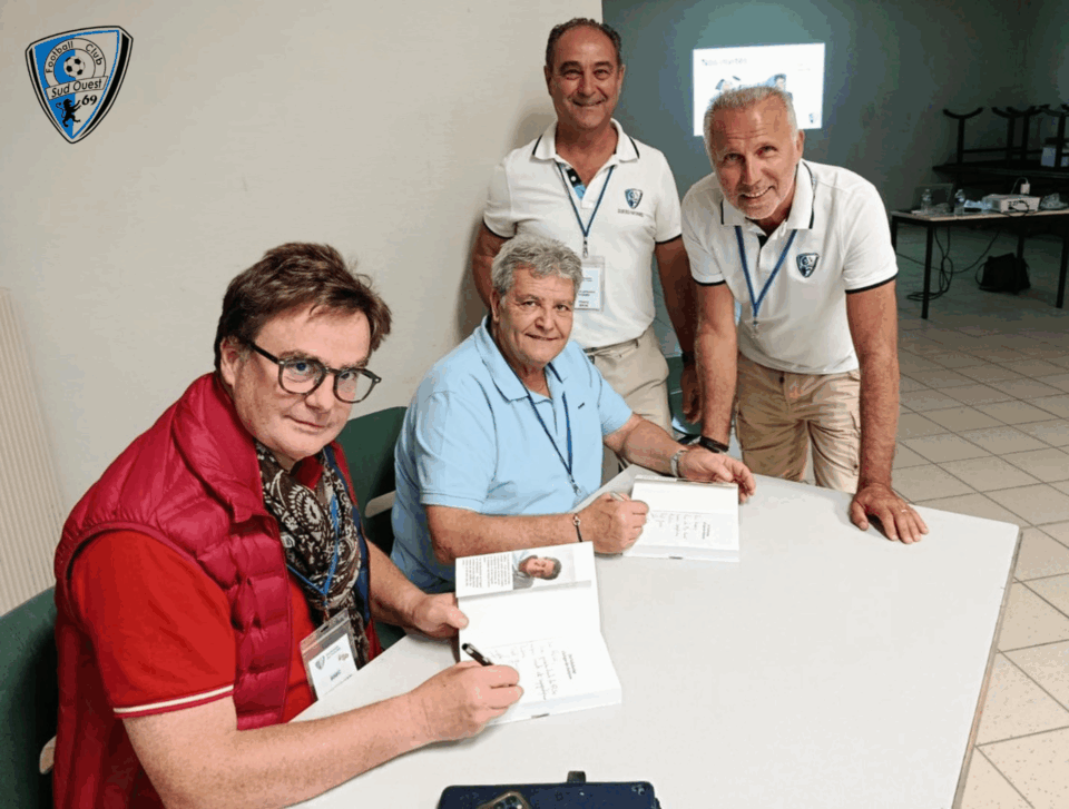 C'était lors de la présentation du livre « De l'échafaudage à la Ligue des champions » coécrit par Fred Guerra (en bleu), agent de joueurs et personnalité marquante du football français, et Edward Jay (en rouge), journaliste et correspondant pour RMC Sport.