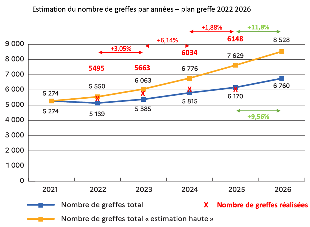 En cette quatrième - et avant-dernière - année du 4ᵉ Plan Greffe (2022-2026), le nombre de greffes réalisées se situe désormais en-deçà de la borne basse du « couloir de croissance » fixé par le plan, toutes greffes confondues. La même tendance est observée pour les greffes rénales issues de donneurs vivants.