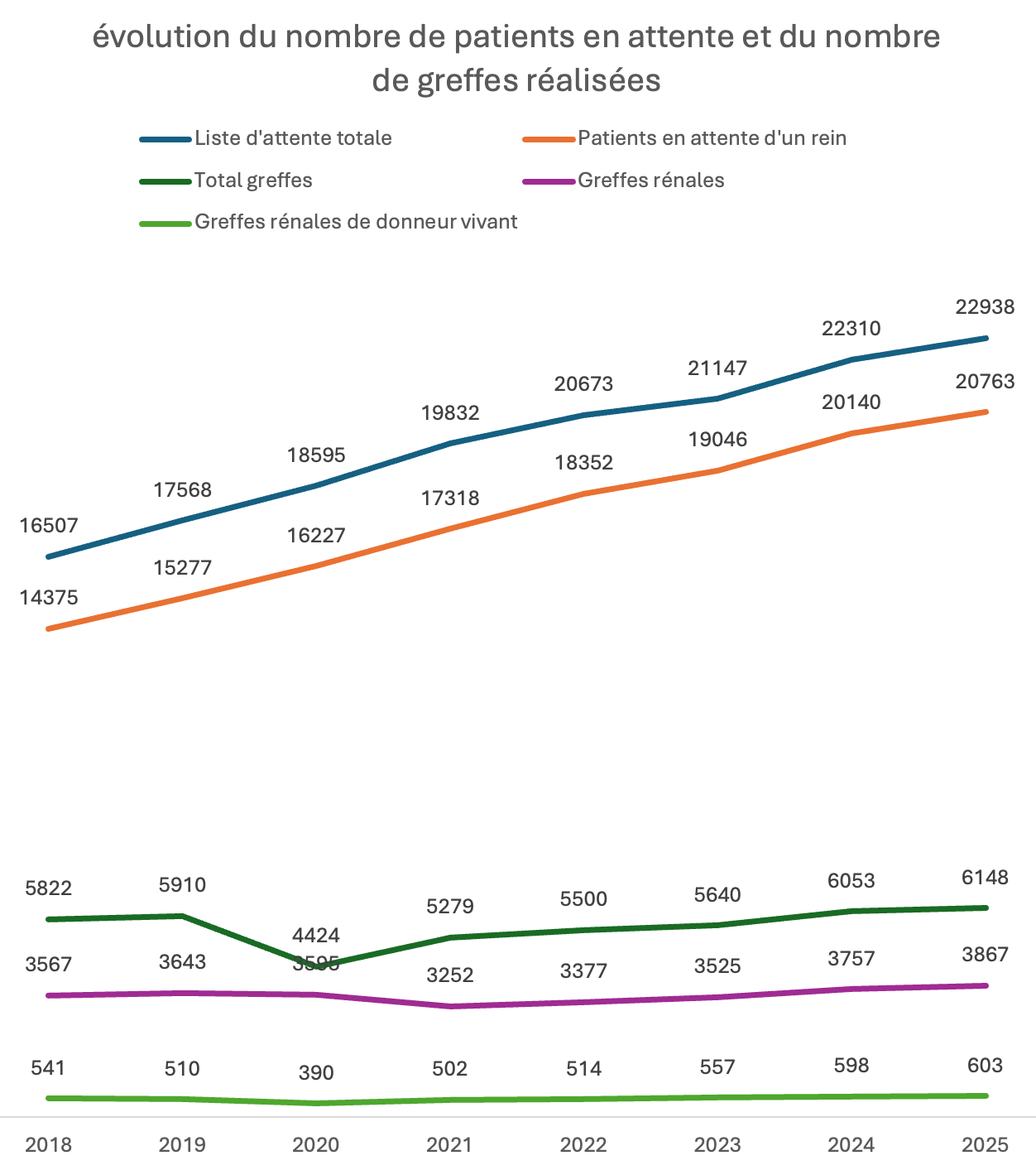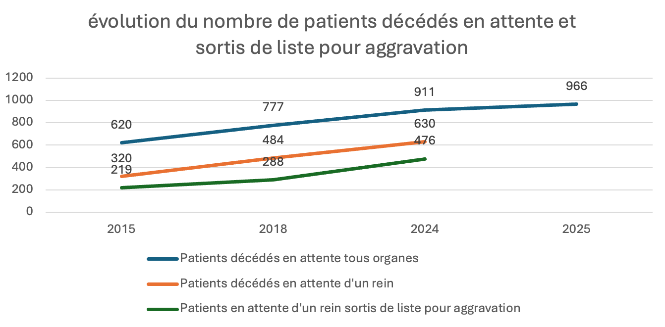 Les données 2025 des décès et sorties de liste des patients en attente de greffe rénale ne sont à ce jour pas disponibles.